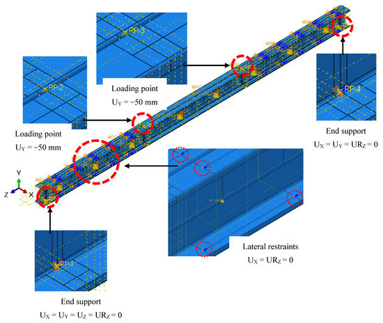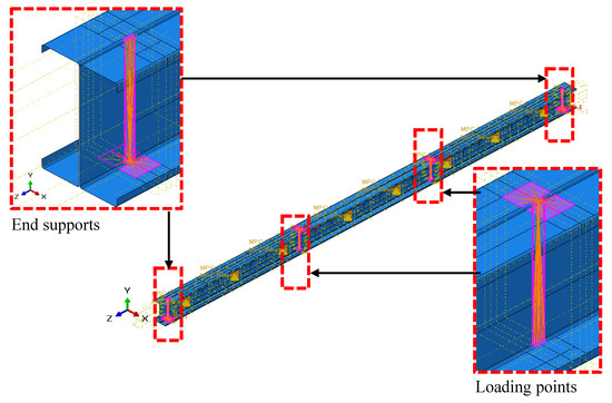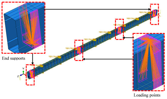 The static general analysis with the specification of damping factor was used in this study following its validation. Interaction between contact surfaces of webs in back-to-back models whilst between flanges in closed models were defined with the surface-to-surface contact method with tangential and normal behaviours. Tangential behaviour was defined to be frictionless, whereas normal behaviour is defined as hard contact in this study. Further, loading and supporting boundary conditions were applied to the created reference points where each region was coupled to a reference point kinematically in all degrees of freedom. The coupled regions in both of the back-to-back and closed models are illustrated in Figure 14 and Figure 15, respectively. Moreover, lateral restraints at 300 mm intervals were applied along the beam to avoid lateral torsional buckling. Applied boundary conditions are shown below in Figure 16. The screw arrangements in the web and flanges were incorporated by creating connectors with the MPC connection-type beam. Then, the screw connections were created and assigned to the connector assignment as well.