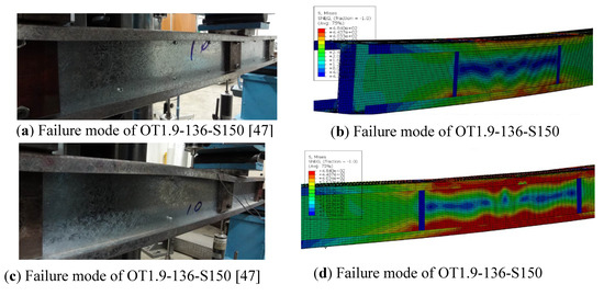 The experimental and FE failure modes of cold-formed steel built-up open section OT1.9-136-S150 and OT1.9-136-S300 are illustrated in Figure 17. Similarly, FE failure modes comparison of cold-formed steel built-up closed section CT1.2-136-S150, CT1.2-136-S300 and CT1.2-136-S600 are illustrated in Figure 18. Since failure modes were observed to be similar from both experimental and FE failure modes, it can be concluded that the developed FE models well predict the failure mechanisms of built-up sections.