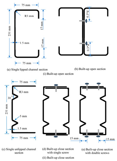Lipped channel sections used by Gatheesghar et al. [35] were selected in this study to investigate the flexural behaviour of built-up sections with different screw arrangements. First, back-to-back models were created using lipped channel sections whilst unlipped channel sections with intermediate stiffeners in web were chosen for closed models. The sections used for the back-to-back and closed models are shown in Figure 21. The stiffeners in the web element were introduced to unlipped channel sections (closed models) to cover the similar coil length of lipped channel sections. All the sectional dimensions including screw spacing used for the investigation of flexural performance are illustrated in Figure 21. The screws in open built-up sections were placed in the web at a distance of 0.3 d (0.3 times the depth of the beam) from both flanges (Figure 21b). The spacing between screws in the longitudinal direction was changed to 50 mm, 100 mm, 200 mm and 600 mm. In the meantime, two various screw arrangements were considered in the investigation of closed built-up sections. First, one screw at the middle of both flanges was connected in the longitudinal direction and then two screws in the distance of 15 mm from both end of the closed sections at both flanges were placed as shown in Figure 21d,e, respectively. The longitudinal distance between screws was changed as 100 mm and 600 mm for closed built-up sections. The parameters chosen in this study for both the open and closed studies are illustrated in Table 7. In total, 16 parametric models were investigated covering single and built-up lipped and unlipped channel sections with various screw arrangements including two different yield strengths. The models were generated and analysed following the validation.