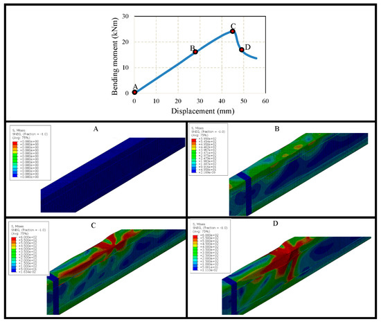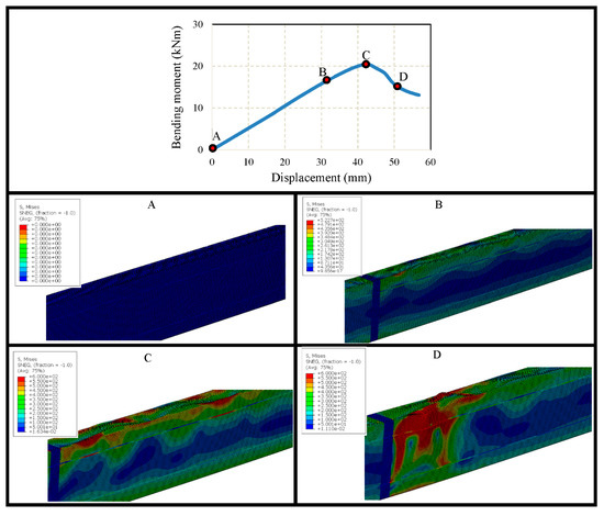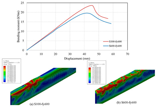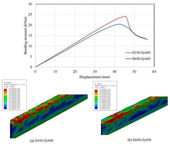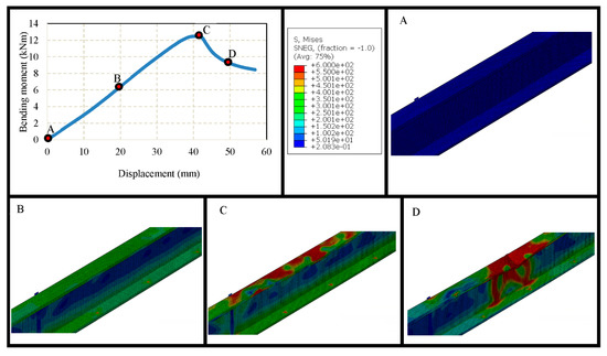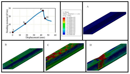 Since open built-up models are analysed using lipped channel sections, single models with 450 MPa, 600 MPa yield strengths were created with the sectional parameters as illustrated in Figure 21a, and flexural behaviour was observed for single models. Back-to-back built-up models were created with a longitudinal screw spacing of 50 mm, 100 mm, 200 mm and 600 mm in order to compare the capacity enhancement for built-up models with single models, as well as to observe the effect of screw spacing in the flexural behaviour of open built-up models. Bending moment vs. vertical displacement curve was observed for all open models, and failure modes at various stages were investigated during the study. The bending moment–vertical displacement curve of a single lipped channel section with 600 MPa and corresponding failure modes at initial, before failure, during failure and post-failure stages are given in Figure 22. Similarly, the failure modes and graph for built-up open model with 100 mm spacing is also given in Figure 23. Figure 22 and Figure 23 depict that the beams fail at the top flange and then web fails at the post-failure stage.