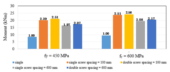 - Well-enhanced bending capacity was observed for high yield strength (600 MPa) compared to lower (450 MPa) for closed built-up sections. Moreover, screw spacing influenced the flexural capacity in both criteria. A double screw spacing of 100 mm was the optimum spacing, which produced maximum bending capacity in both scenarios. A single screw spacing of 100 mm was next with better flexural capacity enhancement in both yield strengths. However, for 450 MPa, bending capacity enhancement was relatively lower compared to 600 MPa sections and relatively higher compared to any open built-up sections.