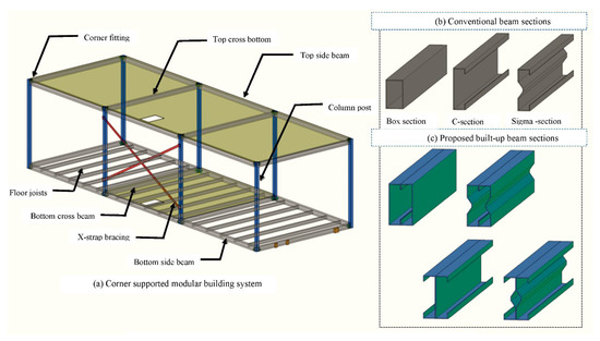 Moreover, longer spans were expected in the modular building industry to increase the space within the building (client’s expectation), improve the indoor aesthetic environment and reduce the material utilization (sustainability). Therefore, built-up sections were introduced to achieve industrialized production by combining two sections’ webs as back-to-back form or combining flanges to form as a box section. Figure 6 shows innovative built-up sections made of combining two channel sections together with self-tapping screws [47]. Built-up sections ensure more torsional stiffness due to its biaxial symmetrical nature, higher load-bearing capacity, increased spanning distance and more convenient connections [48], which are ideal features for utilization as joists in modular constructions with respect to sustainability targets.