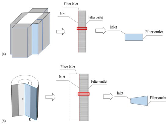 Schematic diagram of the filter structure and airflow direction; (a) combined plate micro-electrostatic filter; (b) cylindrical micro-electrostatic filter.