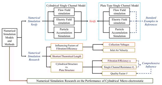 A micro-electrostatic filter is composed of multiple electric field channels, and the movement of particles in an electric field channel determines the performance of the filter. A single channel model is often used for simplified calculation [] to simulate the performance of the electrostatic filter and was adopted in this research. We first used the methods commonly used in the literature [,] to simulate the flow field and the electrostatic field, and then establish the particle motion and charging model in the electric field channel. The accuracy of the model was verified by using the data and results of Xiong. et al. []. The schematic diagram of the research method used is shown in Figure 2.