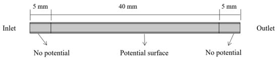 As shown in Figure 3, the physical model of the single channel model is divided into three parts: inlet, electric field channel, and outlet. The central section of the electric field channel, with a length of 40 mm, is used for display, and the electric potential was applied to the outer surface of the outer frame. The inlet and outlet dimensions of the combined plate-type electric field channel are 2.5 mm × 5.0 mm. The inlet and outlet dimensions of the cylinder electric field channel are 2.5 mm × 5.0 mm and 2.5 mm × 7.5 mm. Velocity inlet and pressure outlet boundaries are used for the flow field simulation, and the walls of the electric field channel adopt nonslip boundary conditions. The outlet pressure is set to 0 and the inlet air velocity is set to 1.0 m/s, 1.5 m/s, 2.0 m/s, and 2.5 m/s.