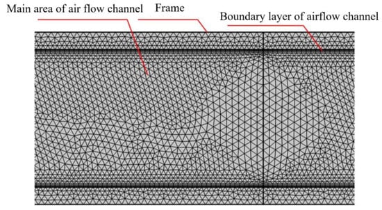 For a single channel, the flow field and the particle field exist only inside the air channel, and there is an electric field in only the outer frame. Therefore, the grid is divided separately into the air channel and the outer frame. Since the electric field calculation is relatively simple, the grid inside the frame is a triangular grid, which is relatively sparse and does not require a boundary layer. The internal grid of the airflow channel is composed of rectangular and triangular grids, and rectangular grids mainly exist in the boundary layer. The overall model has 50,136 domain units, and a partial grid diagram is shown in Figure 4. According to the existing research [], the grid size we use meets the requirements of the simulation and can accurately simulate the flow field.