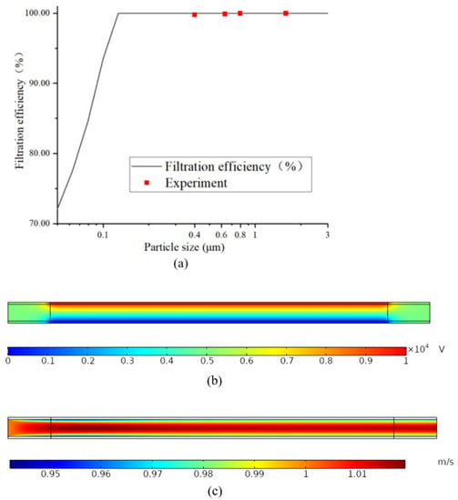 Taking the working condition with an inlet air velocity of 1.0 m/s as an example, we simulated the fractional efficiency by particle size in a single channel, and the verification result of the simulation model is shown in Figure 5a. The black line in the figure is the fractional efficiency by particle size obtained by our simulation model, and the red square is the experimental value shown in Table 3. It can be seen from Figure 5a that the results of the simulation are consistent with the experimental results. In addition, we also simulated the electric field and velocity field of the single channel, and the results obtained are shown in Figure 5b,c. The simulation results of the electric field and velocity field are also consistent with the literature. Therefore, our simulation method and the model we used are feasible.