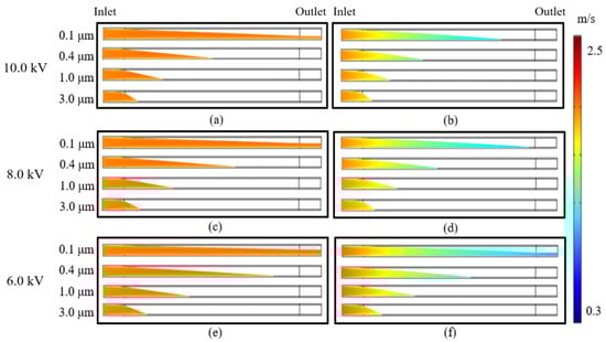 Movement of particles in the electric channels of the two types of micro-electrostatic filters under different dust-collection plate voltages: (a,c,e) show the particle movement of the combined plate-type micro-electrostatic filter at 10.0 kV, 8.0 kV, and 6.0 kV; (b,d,f) show the particle movement of the cylindrical micro-electrostatic filter at 10.0 kV, 8.0 kV, and 6.0 kV.