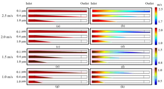 Movement of particles in the two micro-electrostatic filter channels under different air velocities: (a,c,e,g) show the combined plate-type micro-electrostatic filter at 2.5 m/s, 2.0 m/s, 1.5 m/s, and 1.0 m/s; (b,d,f,h) show the movement of particles in the cylindrical micro-electrostatic filter at 2.5 m/s, 2.0 m/s, 1.5 m/s, and 1.0 m/s.