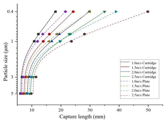 Figure 8 shows the theoretical STL required by the cartridge and combined plate-type filters to trap different sizes of particles at various inlet air velocities. Taking particles larger than 1 μm as the criterion, at 2.5 m/s, the required theoretical STL was 17 mm for the cylindrical micro-electrostatic filter and approximately 25 mm for the plate structure. It can be obtained that the STL required by the cylindrical structure is 34% shorter than that of the combined plate structure. This result means that under the same inlet air velocity, the cylindrical micro-electrostatic filter needs to occupy a smaller volume than the combined plate-type micro-electrostatic filter to achieve the same filtration efficiency. It also makes the cylindrical micro-electrostatic filter more space-saving when used in an HVAC system.