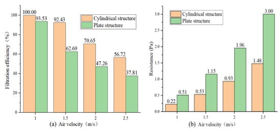 The filtration performance of the two types of micro-electrostatic filters: (a) the filtration efficiency of the two types of micro-electrostatic filters for 0.1 μm particles at different air velocities; (b) the single channel resistance of the two structures.