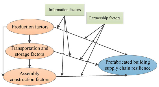 Research on supply chain resilience at home and abroad has matured and the influencing factors of it are more comprehensive than those covering the characteristics of the supply chain itself and the external environment. However, considering the difference between the generalized supply chain and the PBSC, the influencing factors of the above research are not completely consistent with and the PBSC resilience. PBSC is a relationship chain involving the collaborative management of vertical multi-level enterprise units. It is a task chain based on multi-resources, such as materials, equipment and information technology, which tends to multi-objective integrated management. The influencing factors of it involve multiple organizations, processes and dimensions. Luthra, S (2015) divided the impact of SCR into internal and external categories [29]. The internal includes risks related to the production capacity and operations and the external includes nature, political systems and markets. It is difficult to assess due to external shocks, such as sabotage, terrorist attacks and coups. Therefore, combined with the construction characteristics and development status of PB, this article aims to consider the influencing factors that affect the entire process, focusing on the three main PBSC processes (PC production-transportation and storage-influencing factors-assembly and construction, namely PC production-transportation and storage-influencing factors-assembly construction) from the perspective of resilience. Based on research literature at home and abroad, the relationship between path hypotheses is proposed and the conceptual model is established as follows:
