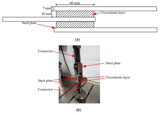 The sandwich viscoelastic damper consists of two viscoelastic material layers and three steel plates. The shear area of the viscoelastic damper is 60 mm × 50 mm, and the thickness of shear layer is 10 mm. The viscoelastic material is developed independently based on the nitrile rubber [11], and the steel type for the steel plates is Q235. The steel plates and viscoelastic layers of the damper are closely fixed with each other by chemical bonding in the vulcanization process and deform in different directions under cyclic external loading. The mechanical energy generated from external loading can be dissipated by the shear deformation of viscoelastic layers, and some parts of the mechanical energy are dissipated into the air in heat form. The schematic picture and photo of the viscoelastic damper are given in Figure 1a,b.