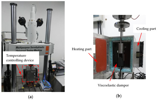 Properties test of the viscoelastic damper: (a) tests of the viscoelastic damper; (b) temperature controlling device.