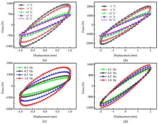 Representative force-displacement curves of the viscoelastic damper: (a) d = 1.0 mm, f = 0.2 Hz; (b) d = 2.0 mm, f = 0.1 Hz; (c) T = −5 °C, d = 1.0 mm; (d) T = 15 °C, d = 2.0 mm.