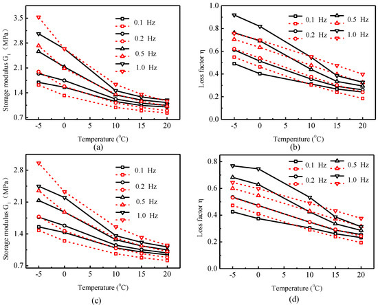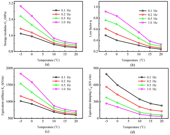 Figure 5 presents the characteristic parameters of the sandwich viscoelastic damper with changing temperature from −5 °C to 20 °C when the displacement amplitude is 1.0 mm. It is easy to see that the storage modulus, loss factor, equivalent stiffness and equivalent damping decrease significantly by increasing the temperature, especially at low temperatures (from −5 °C to 10 °C). Taking 1.0 Hz as an example, the storage modulus decreases by 15.91% in the range of −5 °C to 0 °C, decreases by 43.25% in the range of 0 °C to 10 °C, decreases by 12.14% in the range of 10 °C to 15 °C and decreases by 6.8% in the range of 15 °C to 20 °C. The loss factor decreases by 8.63% in the range of −5 °C to 0 °C, decreases by 34.86% in the range of 0 °C to 10 °C, decreases by 29.62% in the range of 10 °C to 15 °C, and decreases by 14.91% in the range of 15 °C to 20 °C. The equivalent stiffness decreases by 13.77% in the range of −5 °C to 0 °C, decreases by 44.66% in the range of 0 °C to 10 °C, decreases by 12.14% in the range of 10 °C to 15 °C, and decreases by 6.8% in the range of 15 °C to 20 °C. The equivalent damping decreases by 23.17% in the range of −5 °C to 0 °C, decreases by 63.03% in the range of 0 °C to 10 °C, decreases by 38.17% in the range of 10 °C to 15 °C, and decreases by 20.7% in the range of 15 °C to 20 °C.