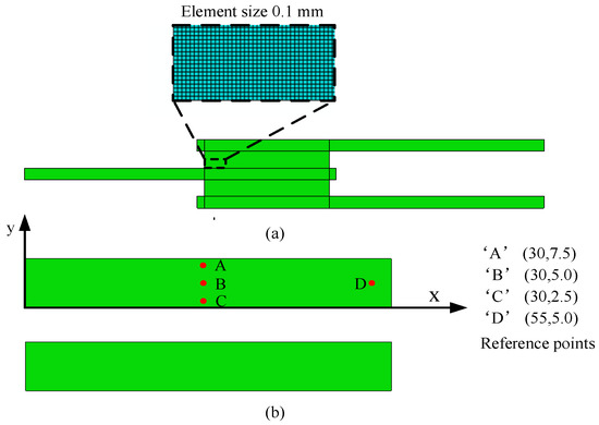 In the finite element simulation, the displacement amplitude of the viscoelastic damper is 1.0 mm, and the ‘Coupled-Temperature-Displacement’ time step is employed to simulate the thermo-viscoelastic behaviors of the material. The ‘CPE4T’planar element type is used for meshing of viscoelastic damper. In order to avoid the element distortion with a large number of loading cycles, the element size of the viscoelastic layer is selected as 0.1 mm, while the element size of the steel plate is getting larger and larger when it is gradually getting away from the viscoelastic materials. The total number of finite elements of the 2-D model is 255428. In order to better understand the temperature rising at different positions of the viscoelastic layer, four reference points ‘A’, ‘B’, ‘C’ and ‘D’ are selected in the viscoelastic layer, as seen in Figure 8b. A local coordinate system is defined in the upper viscoelastic layer, and the coordinates of the reference points ‘A’, ‘B’, ‘C’ and ‘D’ are (30,7.5), (30,5.0), (30,2.5) and (55,5.0), respectively.