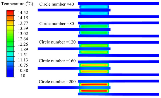 The heat convection coefficient between the surfaces of the viscoelastic damper and surrounding environment is taken as 6 [38]. The model of the viscoelastic damper is subjected to 200 cycles of displacement loading . When the displacement amplitude is 1.0 mm and the loading frequency is 5.0 Hz, the temperature contours of the viscoelastic damper at different loading circles are shown in Figure 9.