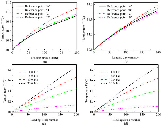 The temperature increment at the reference points with increasing loading circle numbers: (a) f = 1.0 Hz; (b) f = 5.0 Hz; (c) Reference point ‘B’; (d) Reference point ‘D’.