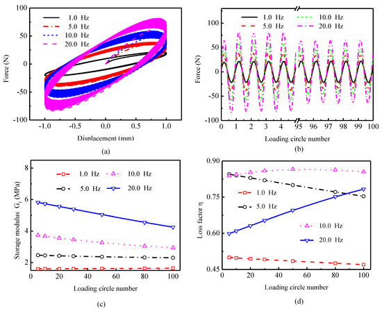 The FEA results of the storage modulus and loss factor of the viscoelastic damper are shown in Figure 11c,d, and the storage modulus decreases when the loading cycles increase. The loss factor decreases as the number of loading circle increases at low frequencies (1.0 Hz and 5.0 Hz); and increases with the increasing loading cycles at high frequencies (10.0 Hz and 20.0 Hz). Taking the 10th, 30th, 50th and 80th circles with 10 Hz as examples, the FEA results of storage modulus are 3.6793, 3.4528, 3.2663 and 3.0417 MPa, respectively. It decreases by 6.16% in the range of the 10th to the 30th loading circles, decreases by 5.4% in the range of the 30th to the 50th loading circles and decreases by 6.88% in the range of the 50th to the 80th loading circles.