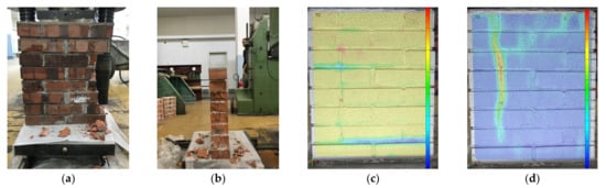 Testing of compressive strength—vertical splitting of masonry prism: (a) front view; (b) side view; (c) vertical deformations; (d) horizontal deformations.