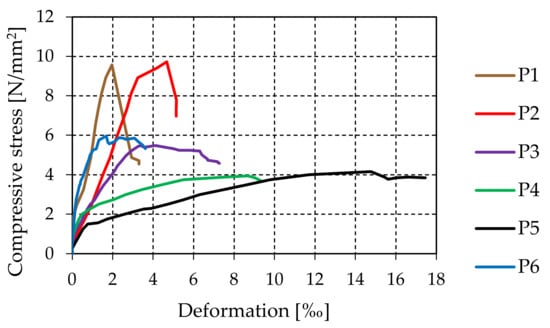 The resulting mechanical properties are presented in Table 1. Figure 2 shows the experimentally determined stress-deformation diagrams for six masonry prisms. Vertical displacement of each prism is defined as the average displacement of all LVDTs. The compressive stress is defined as the relationship of the vertical load and the initial prism surface, despite the joints not being completely filled. The compressive strength amounted to 6.48 N/mm2 on average. The coefficient of variation (COV) was quite large and it was equal to 36%. The mean value of Young’s modulus was 4024 N/mm2, with a COV of 46%. If experimentally obtained values of the modulus of elasticity are compared with the recommendation given in EC 6, according to which Em = 1000 fk [], one can conclude that the test yielded significantly lower Young’s moduli. However, according to Tomaževič [], the elastic modulus can vary in the range of 100 fk ≤ Em ≤ 1000 fk.