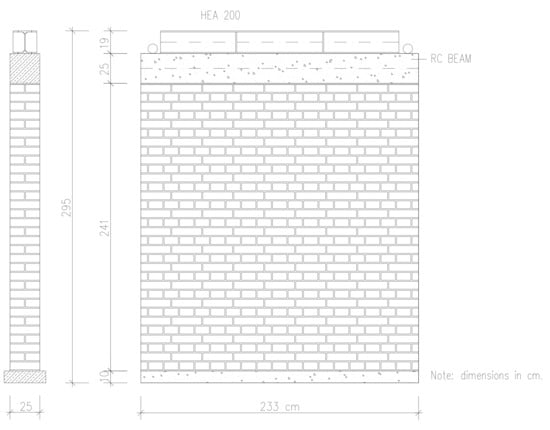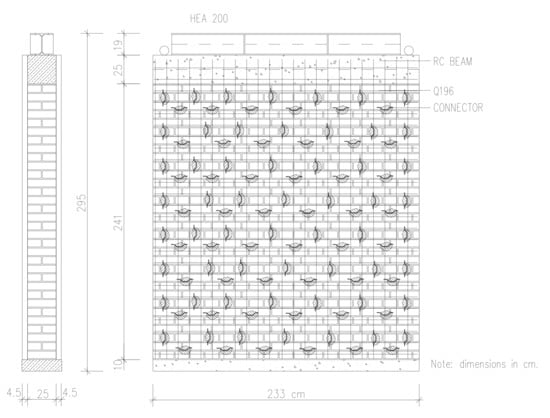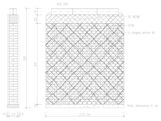 The geometry of the URM wall was adapted to the available test equipment with additional restraining elements. It corresponds to a wall in an existing building typical for the period after World War II. All samples were built in the structural laboratory of the Institute for Materials and Structures, Faculty of Civil Engineering in Sarajevo. Dimensions of the unstrengthened walls (W1 and W2) are l/h/t = 233/241/25 cm (Figure 3). The height-over-length ratio of the walls is approximately 1:1, so the specimens do not belong to either slender or long walls. They are mounted on a beam consisting of a UNP400 steel profile filled with concrete. A thin mortar layer was installed at the top of the beam to level the first row of bricks. Before placing mortar, bricks were immersed in water to achieve better bond and prevent early drying of mortar. All vertical joints are filled with mortar. Horizontal joints were made using spacers to ensure constant thickness of the joints.