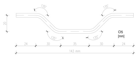 Unlike the plain wall, the strengthened wall has additional reinforced concrete jacketing 4–5 cm thick over both wall faces. With the exception of concrete C35/45 (maximum grain size 16 mm) and reinforcement B500S, they are constructed of the same materials whose mechanical properties are shown in the previous chapter and in []. Strengthened walls were built in several stages. After the bricks were laid, Q196 (Ø5/10 cm) reinforcement mesh was installed on both sides. The mesh was placed in the direction of principal stress trajectory at an angle of 45° (135°) on the first wall (W3) and attached to the wall utilizing U-shaped anchors Ø5mm (Figure 4) (strengthening Type I). The anchors were also inclined and placed into pre-drilled holes grouted with cement mortar. In order to ensure the full bond, there were approx. 25 connectors/m2 on one side of the wall. The number of anchors is significant, which might be unrealistic in practical cases.