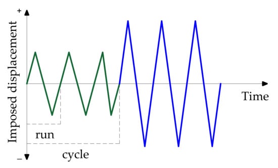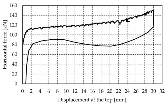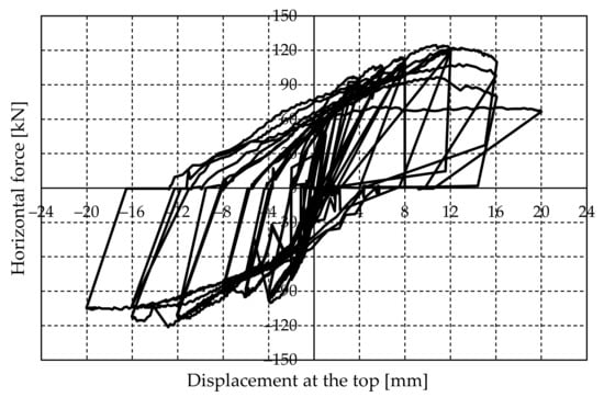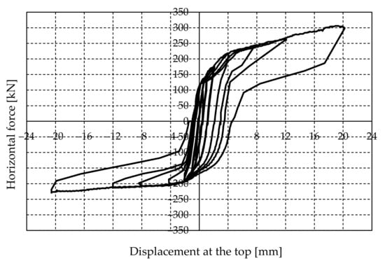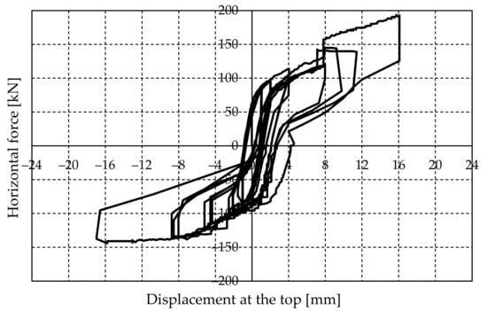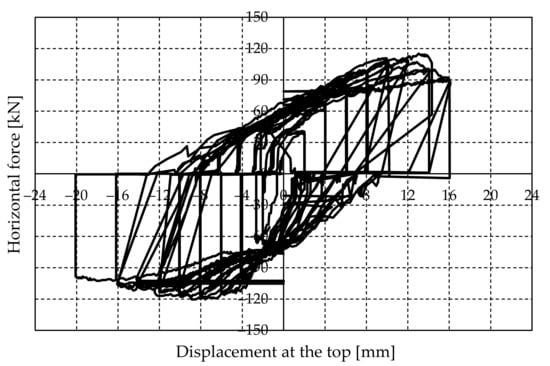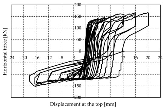 - Next, a lateral force is applied to the upper reinforced concrete beam until the required displacement is achieved. The test was performed by the controlled imposition of displacement increments, and each cycle consisted of three runs (repetitions). Figure 8 illustrates the characteristic displacement history in pseudo-time. However, depending on the actual wall response and intensity of the force, three runs were not always performed in a cycle. The experimental investigation was aborted when relatively large cracks appeared.