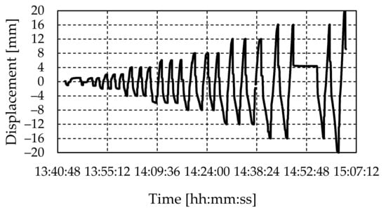 Cyclic horizontal in-plane load was applied by imposing displacements over the RC beam at the top of the wall. Typical variation of displacements over time is shown in Figure 9 for W1. Each load cycle consisted of three runs, except at a displacement of 20 mm when the experiment was interrupted. To protect measuring instruments in the event of a possible wall collapse, the test was paused at a displacement of 16 mm when most of the recording devices were removed. The experiment lasted approximately 90 min.