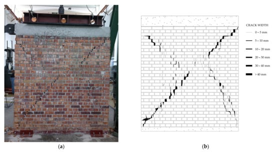 Wall W2 after testing: (a) photograph; (b) crack pattern and crack width.