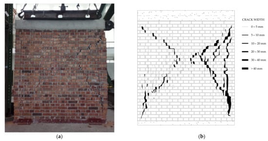 The experimental part of the research started with the tests on masonry constituents, brick, mortar, and their interface []. This was followed by tests on full- and half-scale unreinforced masonry walls exposed to constant gravity load and horizontal in-plane forces applied at the top of the wall. The third phase included walls strengthened with reinforced jacketing. Horizontal forces were applied as a static cyclic load, which increased incrementally.