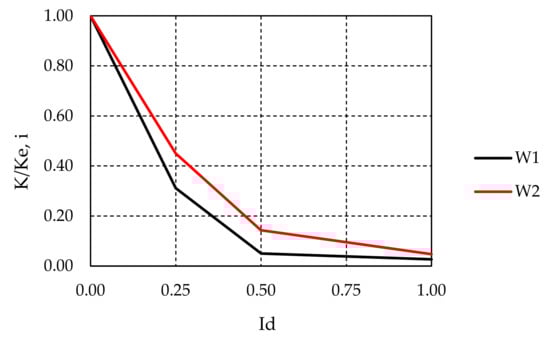 Degradation of stiffness is an important parameter of structural behavior because the load is distributed to the walls depending on stiffness. For example, after the failure of one wall, load redistribution occurs depending on the residual stiffness of the other walls. Stiffness degradation is expressed through the ratio of the secant stiffness K and the initial stiffness Ke,i (or K and the idealized elastic stiffness Ke). It can be calculated for any displacement, or only for characteristic limit states, which was carried out here. Characteristic limit states can be described by damage index Id given by []: