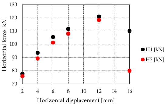 Degradation of shear resistance between the first and the third step within the characteristic cycle is shown in Table 4 (W1 and W2) and in Figure 15 (for W1). It can be concluded that the reduction of resistance was not significant except at large displacements (16 mm).
