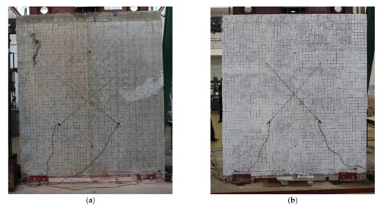 As expected, plain walls W1 and W2 failed in shear. The failure was characterized by cross-diagonal cracks that ran through the brick or brick-mortar contact. A generally stair-shaped cracking pattern for W1 and W2 is shown in Figure 10 and Figure 11. Crushing and local buckling were observed in the corners. Fissures first began to appear in the wall center, and cracks over 40 mm in width were recorded at the final stage. The final crack width was twice as large as the imposed displacement which was caused by the accumulation of plastic deformation (slip) along the main diagonal cracks. Unlike W1, due to high local pressure, a vertical crack (brick splitting) formed and almost separated the column at the right side of W2 (Figure 11).
