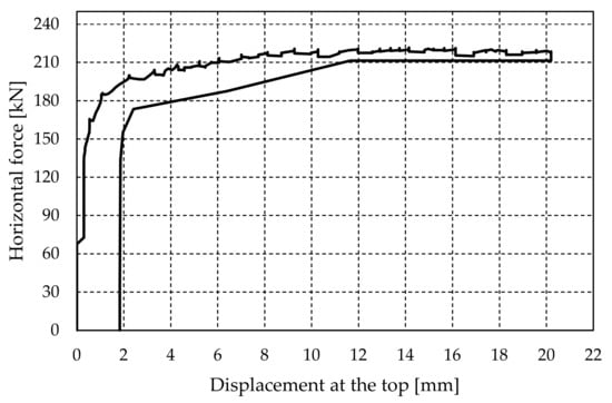 Since shear failure did not occur for vertical precompression equal to σv = 0.4 N/mm2, the jacketed walls were tested under the increased vertical force of V = 460 kN (σv = 0.8 N/mm2). The loading program was simplified so that the cycle consisted of only one run. As in the previous case, there was no shear failure with the appearance of diagonal cracks. The walls rock as a rigid body. The experimentally obtained hysteresis curves are shown in Figure 20 (W3) and Figure 21 (W4). The pushover curve for W4 is given in Figure 22. The maximum force and the force at the maximum displacement were approximately equal and amounted to 215 kN. The wall was equally ductile regardless of the increase in vertical compressive stress.