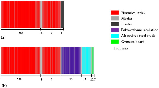 Geometry and meshing of the 1D cross-section of brick masonry wall assemblies: (a) masonry wall without insulation (Base wall) and (b) masonry wall with interior insulation (Retrofit).