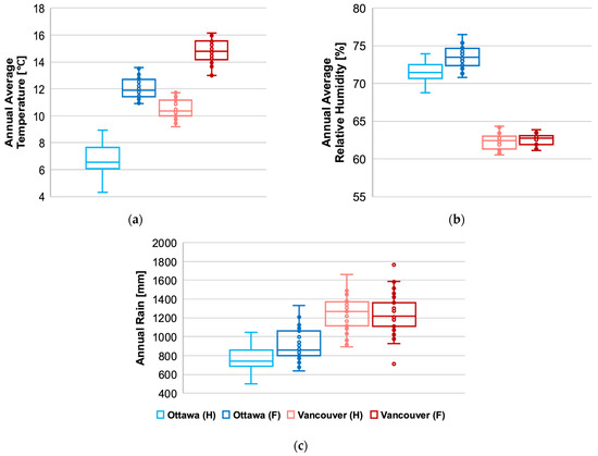Comparison of (a) annual average temperature, (b) annual average relative humidity, and (c) annual rainfall, during the time periods of 1989–2016 (H) and 2062–2092 (F) in Ottawa and Vancouver.