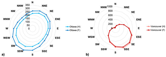 Two locations of two different climatic regions in Canada were selected for this study: Ottawa (Ontario) and Vancouver (British Columbia). Their geographical locations, weather data (Figure 2) and respective climate zone according to the National Energy Code of Canada for Buildings [54] are listed in Table 2. The wall orientation facing North and the one receiving the highest amount of annual wind-driven rain calculated according to ASHRAE [48] were both selected for simulations. To determine this critical orientation, an analysis of the prevailing wind direction (during all hours and rain hours only) and the driven-rain index was performed for historical and future data periods. Using the airfield WDR index (IA) (Equation (10)) [55], the wall orientation with the most severe WDR intensity was 202.5° and 157.5° from the North for Ottawa and Vancouver, respectively (Table 2 and Figure 3).
