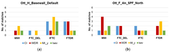 Four different climate-based indices, commonly used in the literature, were used for the selection of MRYs and included: the amount of Wind-Driven Rain (WDR), the Moisture Index (MI), the Climatic Index (CI), and the Severity Index (Isev). Part of these climate-based indices were introduced in [47]. Four freeze-thaw performance indicators were calculated based on output from hygrothermal simulations, i.e., response-based indices were used to evaluate the potential risk of freeze-thaw damage. These are comprised of the Modified Winter Index (MWI), Indicative Freeze-Thaw Cycles (IFTC), Freeze-Thaw Damage Risk (FTDR) and, the number of Freeze-Thaw cycles output from Delphin (FTCd). These indices were calculated for each simulated case, and MRYs were then chosen based on these four indicators. Three methods of comparison amongst MRYs were used in the analysis to evaluate the reliability of climate-based indices in selecting MRYs and were selected based on values obtained for climate-based indices and response-based indices derived from simulations. These included: matching year method, scatter plots method, and the Salonvara et al. method [45].