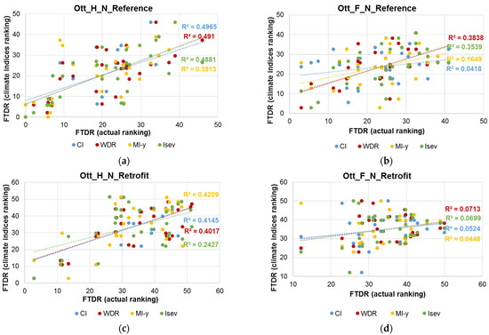 In summary, all three methods indicate that the ranking performance of climate-based indices is generally poor compared to the ranking based on response-based indices (i.e., the actual performance) from simulations, and inconsistent for different scenarios. Relying on counting the number of matching years between the climate-based indices and the response-based indices based on their ranking alone is not sufficient to draw conclusions, given the results were not consistent. Both the scatter plots and the method developed by Salonvaara et al. provided a more quantitative evaluation of the ranking performance of the climate-based indices, which varies with different scenarios. The scatter plot method compared the correlation between climate-based and response-based indices ranking for all years in each time period, while the Salonvaara et al. method applies to ranking the three most severe years only through the normalization of the performance indicator. Both methods indicated that, in general, the FTDR has a better correlation with the climate-based indices, and particularly with CI and MI in Ottawa and MI in Vancouver.