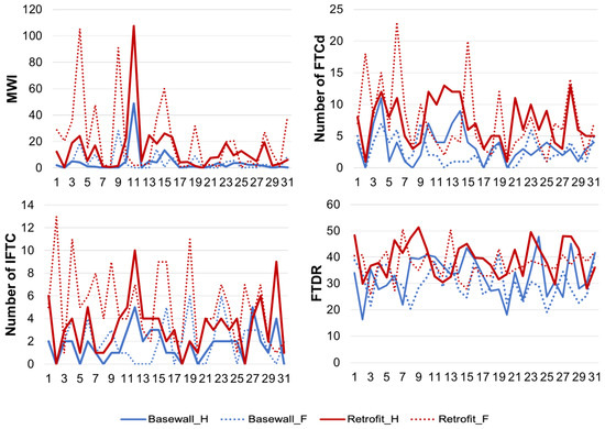 In general, adding interior insulation will increase the risks of freeze-thaw damage as indicated by the values given for all four response-based indices. In Ottawa, the MWI increased in certain years and the difference between a base wall and the retrofit reached a maximum of 60 during the year 1996. In addition, the number of freeze-thaw cycles, as derived from the results of Delphin simulations (FTCd), increased by a maximum of 10 cycles during 2013, and the number of indicative freeze-thaw cycles (IFTC) increased by a maximum of five cycles during 2015. As for the FTDR index, it increased by a maximum value of 23 during 2012. Besides, the effect of adding interior insulation was even more significant in the future. For instance, an increase of 86 (in 2065), 19 (in 2076), 13 (in 2063), and 21 (in 2068) was observed for MWI, FTCd, IFTC, and FTDR, respectively.