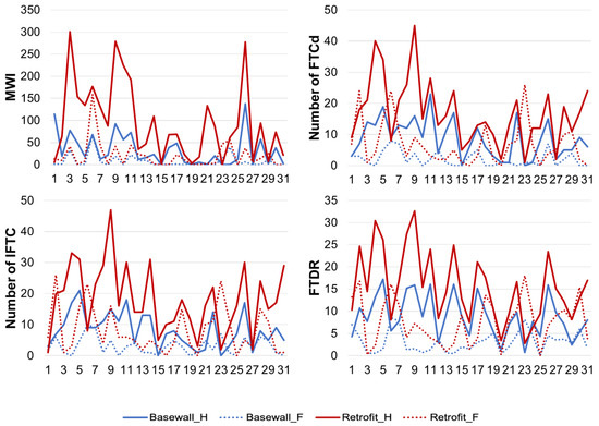To assess the influence of interior insulation on the risk to frost damage of historical brick masonry walls under a changing climate, the risks to frost damage as calculated from simulation results were compared. The results obtained for a base wall and a retrofitted wall, both facing the prevailing WDR orientation, located in Ottawa and Vancouver, are respectively shown in Figure 7 and Figure 8. The x-axis represents the years in their chronological order for both historical (1986–2016) and future (2062–2092) time periods.