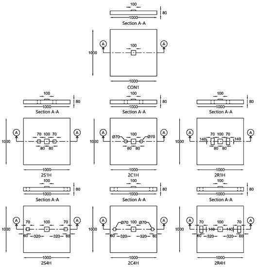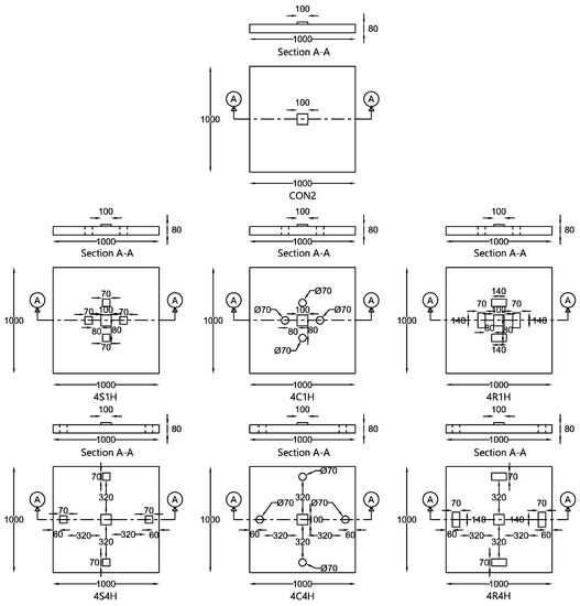 A total of 14 flat slabs were tested in this study. Each specimen was sized to 1000 mm, 1000 mm, and 80 mm in length, width, and depth, respectively. A single 100 mm × 100 mm steel plate was installed concentrically in each slab to simulate a column. Either 2 or 4 openings were provided in each specimen at opposite sides of the column. Size, shape, and location from column’s face of openings in each specimen are provided in Table 1. Square (70 mm × 70 mm), rectangular (70 mm × 140 mm), and circular (70 mm) openings were used to investigate the shape effect of openings on punching shear strength. Effect of the proximity of an opening from column’s face was studied by placing openings at 1 and 4 h from the column’s face, where h is the slab’s thickness i.e., 80 mm. Specimens were mainly divided in 2 groups depending upon the concrete strength. Distance at 4 h was chosen to cover a wide range of distance from column’s face within which an opening could affect the punching shear capacity. It basically creates the lower bound as most recently ACI 318-19 has adopted this distance as the safe distance at which an opening could be placed with minimal effect on the punching capacity of slabs. The other distance (i.e., 1 h) was chosen for practical reasons and is expected to create the upper bound of the deterioration in punching capacity caused by the openings. Therefore, both distances were selected to cover the widest range possible. Each specimen had 1 specimen without any openings to serve as the reference/control specimen. The remaining 6 specimens were subdivided into 3 groups depending upon the shape of opening. Each subgroup of 2 specimens had similar opening shape but its distance varied to the above specified values. Nomenclature for specimens was chosen to represent the number, shape, and location of openings in the same order. For example, specimen 2S1H means that this specimen had 2 square openings located at 1 h from the column’s face on each side of the column. Typical layout of the openings in each slab is presented in Figure 1 and Figure 2 for group 1 and 2, respectively.