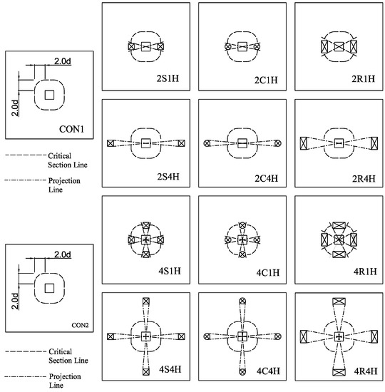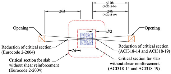As per the recommendations of ACI 318-19, critical shear perimeter b 0 was reduced to account for the presence of openings located within 4 times of slab’s effective depth. Critical shear perimeter was reduced by an area enclosed by two tangents extended to the outline of openings from the center of column as shown in Figure 4. ACI 318-19 and Eurocode 2 consider the maximum location at which an opening can still affect the punching shear capacity of flat slabs to be 4H and 6d from column’s face, respectively (where “H” and “d” are slab thickness and effective depth, respectively). It is to be mentioned that ACI 318-19 recently adopted this distance to be 4H. The previous edition, i.e., ACI 318-14 considered this distance to be 10H from column’s face. This modification is based upon the findings of Genikomsou and Polak [20], who concluded that slabs with openings situated farther than 4H from column’s face essentially exhibited same punching strength as those slabs without openings. Therefore, location of openings were well within the domain specified by ACI 318-19.