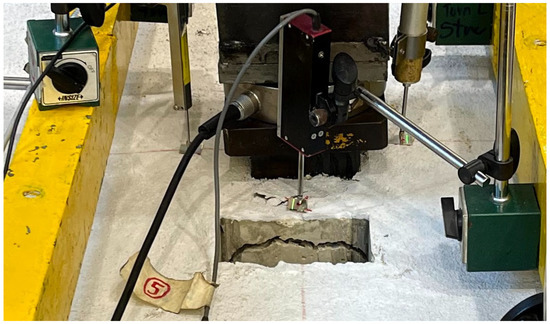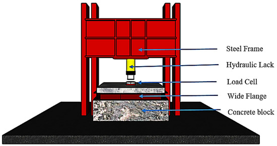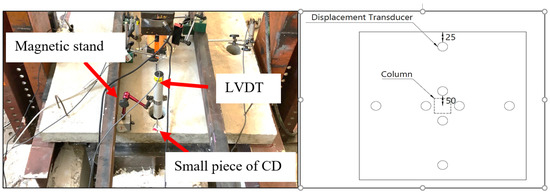 Experimental setup consisted of a hydraulic jack (with capacity of 60 tons), steel frame, load cell, wide steel flanges, and concrete block as shown schematically in Figure 5 (see Figure 6 for actual test configuration). Wide steel flanges were used to support all sides of specimens. Hydraulic jack was used to apply monotonic load at the center of each specimen. The hydraulic jack was placed on the top of the load cell to distribute the load down until it broke through the surface of the specimen. Linear Variable Displacement Transducers (LVDTs) were used to capture vertical deflection of each specimen as well as to monitor the rotation in each specimen. Placement of LVDTs is illustrated in Figure 7. Body of LVDT was affixed to a magnetic stand while its core touch slab specimen.