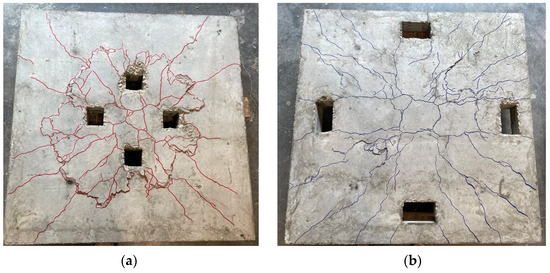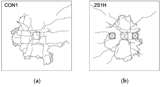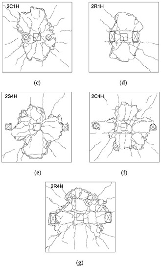 Crack patterns of group 1 and 2 are presented in Figure 8, Figure 9, Figure 10 and Figure 11. For the specimens in group 1, first cracks initiated from the face of columns. With further increase in load, cracks propagated towards the side of slab specimens. It can be seen in Figure 8 and Figure 9 that the distance of openings from column’s face had significant impact on the failure zone of specimens (dark solid lines). Failure zone was narrower and closer to the column when openings were located at a distance of 1 times of slab depth from the column face (Figure 8b–d and Figure 9a). This signifies that relatively smaller slab area contributed towards shear strength when openings were placed nearer the column. Further, for openings at 1H from the column, cracks also initiated from the openings that further deteriorated the shear capacity. On the contrary, specimens with openings located farther from column’s face (i.e., at 4H from column’s face) exhibited lesser cracking than their counterpart specimens and it is interesting to note that no crack initiated from these openings as well (Figure 8e,f and Figure 9b). Specimens in group showed similar trend as those in group 1 as shown in Figure 10 and Figure 11. Cracks intensity and propagation were more severe when openings were placed nearer to the column. Analogous to 4H openings in group 1, cracks did not initiate from openings at 4H from column’s face in group 2 as well. A number of openings also had an adverse effect on shear resistant zone when increased from 2 to 4. For instance, specimen 2C1H had 2 circular openings at column’s opposite side while 4C1H had four circular openings at each side of the column. Comparing their crack patterns at failure, it is interesting to observe that shear failure zone extended farther on sides where no openings were provided (case of 2C1H). Conversely, shear failure zone extended to equal distance from all four sides of column in case of 4C1H. This clearly explains the limit that openings impose on the shear capacity when placed nearer to the column’s face. Comparing the crack patterns for different opening shapes, rectilinear openings allowed the initiation of cracks from all of their corners. Further, crack formation from rectilinear openings was denser as compared to circular section (Figure 10g and Figure 11b).