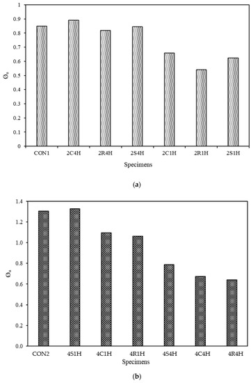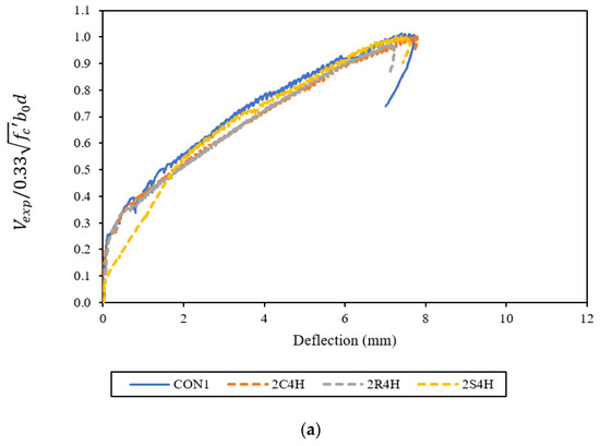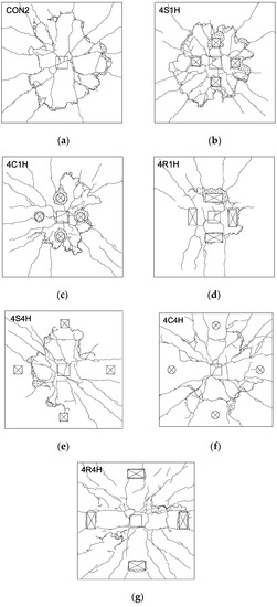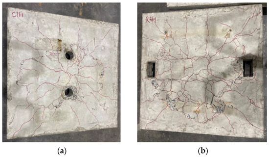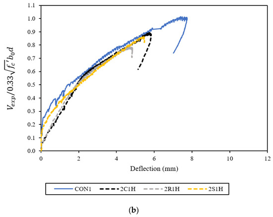 Specimens numbered from 1 to 7 belong to the 1st group having 2 openings while the rest of the specimens belong to group 2 each having 4 openings. The control specimen in group 1 (CON1) was able to sustain highest load i.e., 57.73 kN. For the same distance from column’s face (group 1), specimens with circular openings were able to resist highest loads followed by square and rectangular openings, respectively. For instance, peak load resisted by specimen 2C1H was 51.10 kN whereas corresponding values for specimens 2S1H and 2R1H were 49.09 and 44.71 kN, respectively. A similar trend was observed in peak deflection values as circular specimen underwent highest deflections followed by square and rectangular specimens, respectively. As illustrated in Figure 15, slabs with circular openings outperformed slabs with square and rectangular openings. These findings agree with the previous findings [17] where circular openings had a lower deteriorating effect on punching capacities than rectangular openings placed at the same location in flat slabs. There can be two reasons behind this. Firstly, rectangular openings had the largest area followed by square and circular openings, respectively. Secondly, it has been known that stress concentrations at the corners of rectilinear sections adversely affect their performance in comparison to circular shape where a uniform stress distribution can be assumed. For the openings located at 4H from the column’s face, peak loads sustained by circular and square openings were comparable. However, rectangular openings still created the lower bound in terms of peak load. This can be attributed to larger areas of rectangular openings in comparison with circular and square shape openings.