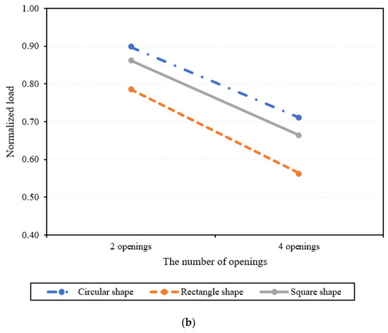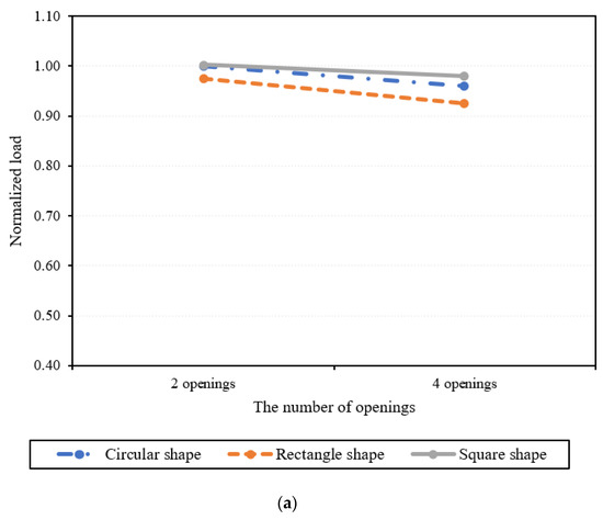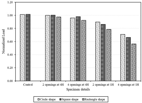 The number of openings also had an adverse impact upon the shear capacity. For comparison, reduction in peak loads (at 1H) for circular, square, and rectangular openings in group 1 were 11.48, 14.97, and 22.44% respectively (see Figure 16a). Peak loads for the same specimens but with 4 circular, square, and rectangular openings (at 1H) were reduced by 30.06, 36.65, and 44.56%, respectively and as shown in Figure 16b.
