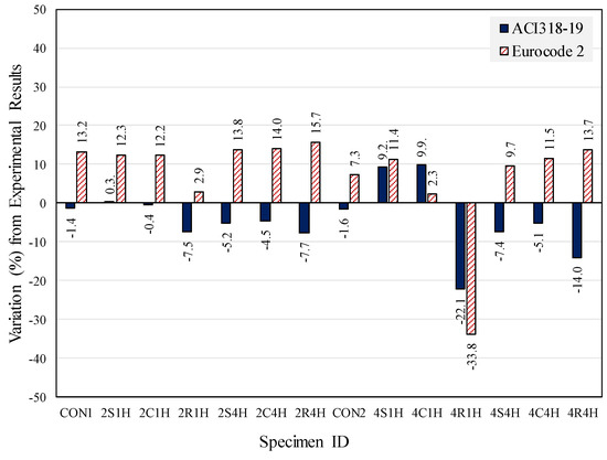 Table 4 presents a comparison between experimental and analytical predicted punching shear capacities of all specimens. It was found that the average difference be-tween experimental and analytical predictions of ACI 318-19 was 4% while the same for Eurocode 2 was 7%. Figure 19 presents the variation of theoretical predictions from experimental results. Punching strengths of control specimens CON1 and CON2 predicted by ACI 318-19 were offset only by −1 and −2%, respectively, from their corresponding experimental values. The same had differences of +13 and +7%, respectively, for Eurocode 2 predictions. ACI 318-19 predictions for control specimens (without openings) were not only closer to the experimental results than Eurocode 2 predictions but they also provided more conservative results. Among group 1 specimens, the largest percentage difference obtained in ACI 318-19 predicted strengths was −8%. The counterpart value for Eurocode 2 results was +16%. It was also observed that ACI 318-19 consistently predicted conservative strengths among group 1 specimens. On the contrary, Eurocode 2 constantly overestimated punching capacities of all the specimens in group 1. Apart from specimens 4S1H and 4C1H in group 2, ACI 318-19 predictions were conservative for the remaining specimens while Eurocode 2 again overestimated punching strengths of all specimens but 4R1H. It is to be mentioned that the error obtained in theoretical predictions of both codes varied with the shape of openings irrespective of their number and location. Therefore, this greatly emphasizes on the need of further research to account for the shape of openings in determining their deteriorating effect on punch capacities of flat slabs. Statistically, ACI 318-19 recommendations yielded a slightly lower standard deviation from experimental results than Eurocode 2. Further, the mean of the ratio of experimental to analytical results was 1.04 and 0.93 for ACI 318-19 and Eurocode 2, respectively.